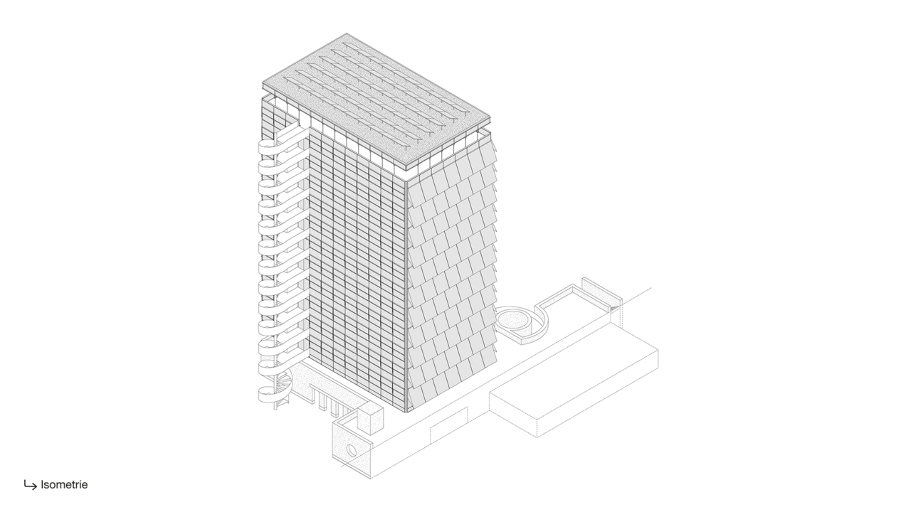 Er überträgt die für Osnabrück typischen mittelalterlichen Art der Holzkonstruktion – die sogenannte Sul-Stütze in den Giebelhäusern der niedersächsischen Stadt – auf die Hochhausform. So kann auf dem kleinen Grundstück durch die auskragenden Geschosse die ausgelobte Bruttogeschossfläche gebaut werden.