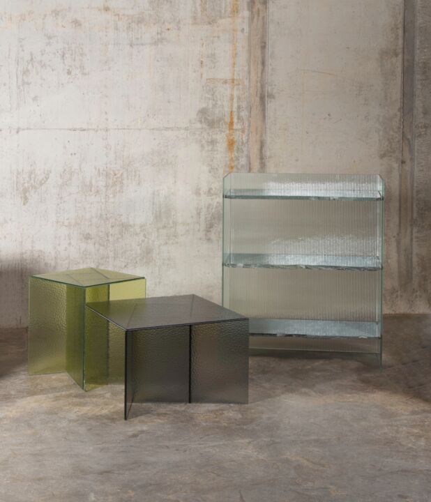 Überhaupt nutzt Herkner das Material Glas mit wachsender Begeisterung, angefangen von der neuen Plissee-Standleuchte und den Oda-Leuchten für Pulpo bis zum Bent-Tischchen für den gleichen Hersteller. Pulpo ist von Glas überzeugt: In Köln präsentierte das deutsche Unternehmen gleich zwei neue Glas-Produkte: das Brut-Regal und den Sofatisch Aspa. Leichte, transparente und minimalistische Möbel auf der Höhe der Zeit. Genauso wie ihr faszinierendes Material: Glas.