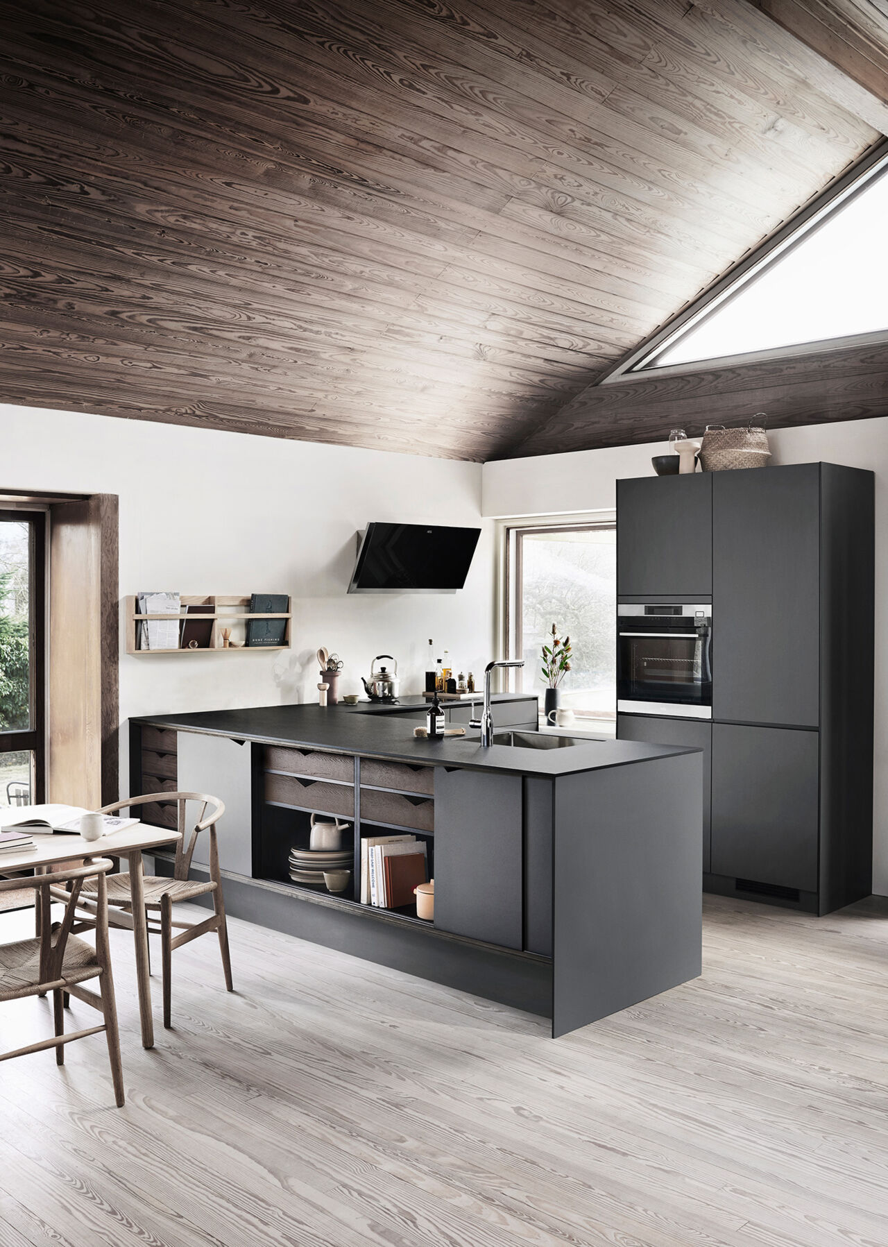 Inselküche Prato von KVIK bietet einen nahtlosen Übergang zum Wohnbereich, schafft eine ruhige Zone und bleibt dennoch offen und einladend – ganz im Sinne der von KVIK ins Leben gerufene Geselligen Küche®. Die Fronten sind gleichzeitig Griffe, das Design zeichnet sich durch matte, geometrische Flächen aus.